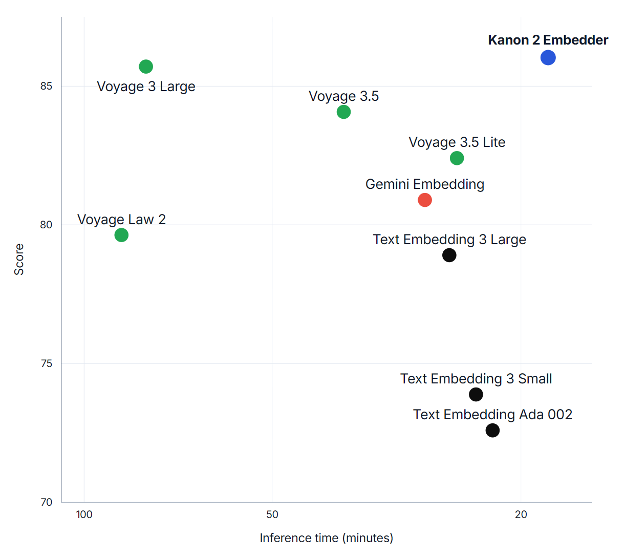 On MLEB, our newly released Kanon 2 Embedder scores highest while simultaneously maintaining the lowest inference time of all commercial competitors, highlighting the extreme accuracy and efficiency gains to be had from domain adaptation.